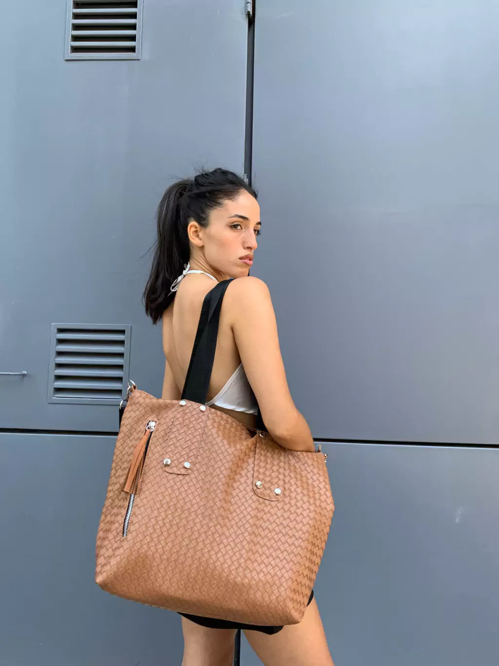 La Cartera Medusa está confeccionada en cuero ecológico graneado o tramado de alto tránsito, pensada para quienes necesitan espacio, estructura y diseño en una sola pieza.